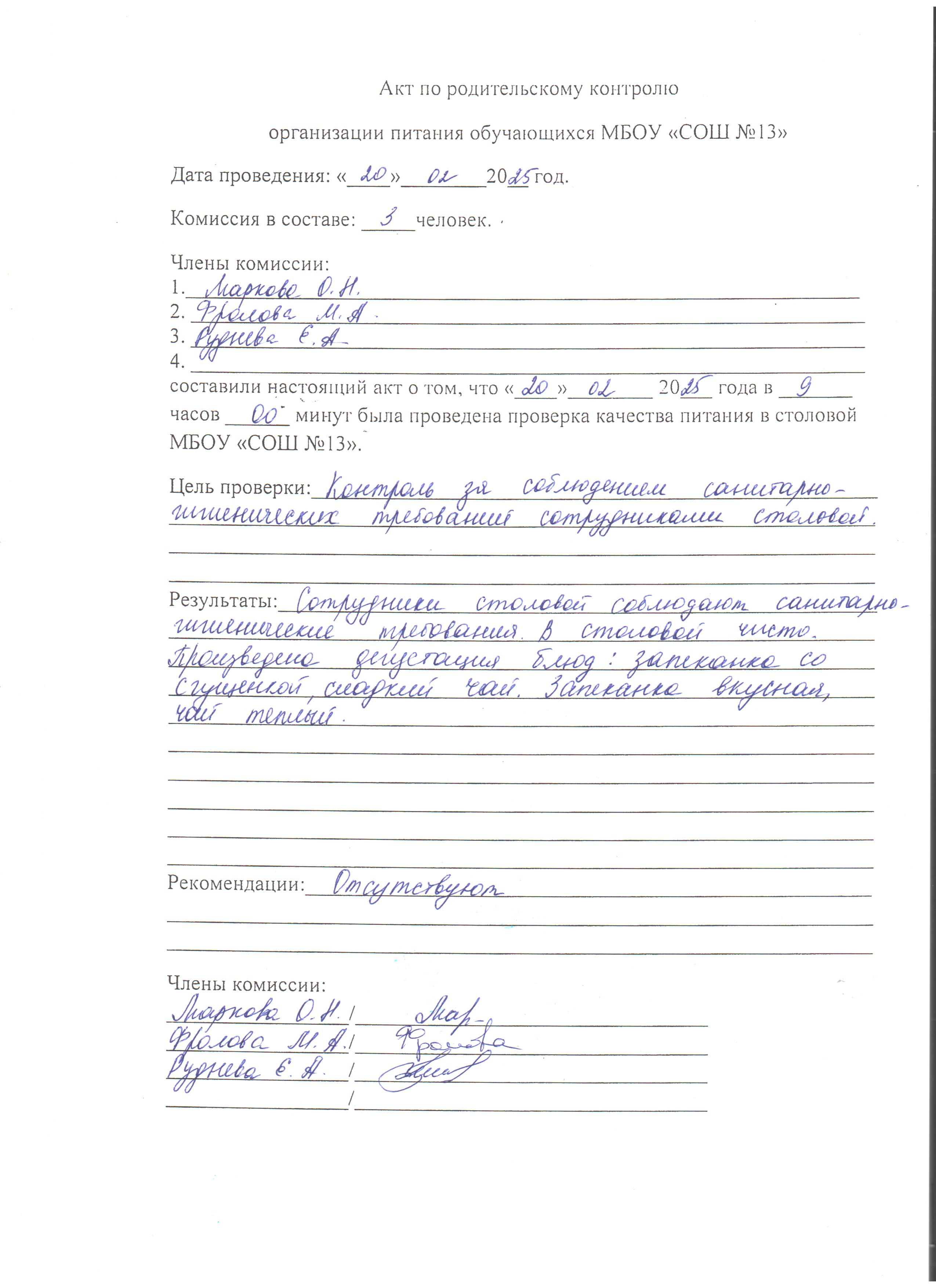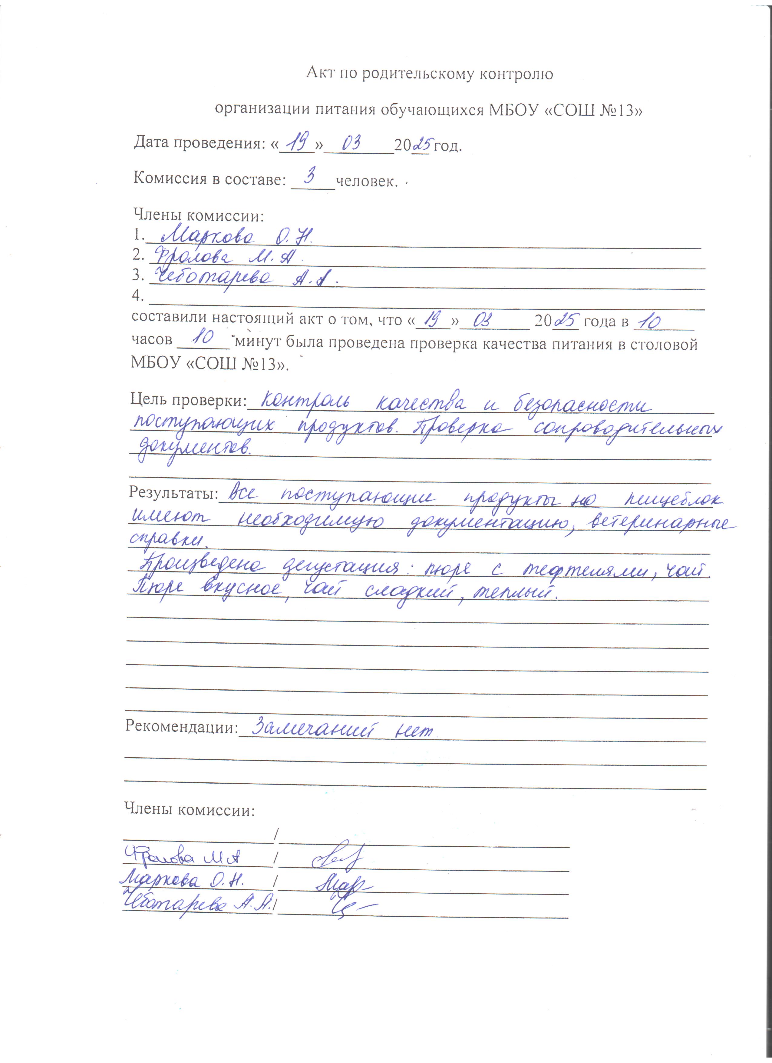 19 ноября 2024г. в МБОУ «СОШ №13» был проведён родительский контроль за организацией питания обучающихся. Выявлено, что ежедневное меню и приготовленные блюда соответствуют 10-дневному меню, повторы в смежные дни отсутствуют. Меню размещено на стойке буфета и ежедневно публикуется на сайте школы. Была произведена дегустация обеда: борщ, картофельное пюре с котлетой. Блюда горячие, в меру солёные. По итогам контроля замечаний не выявлено.